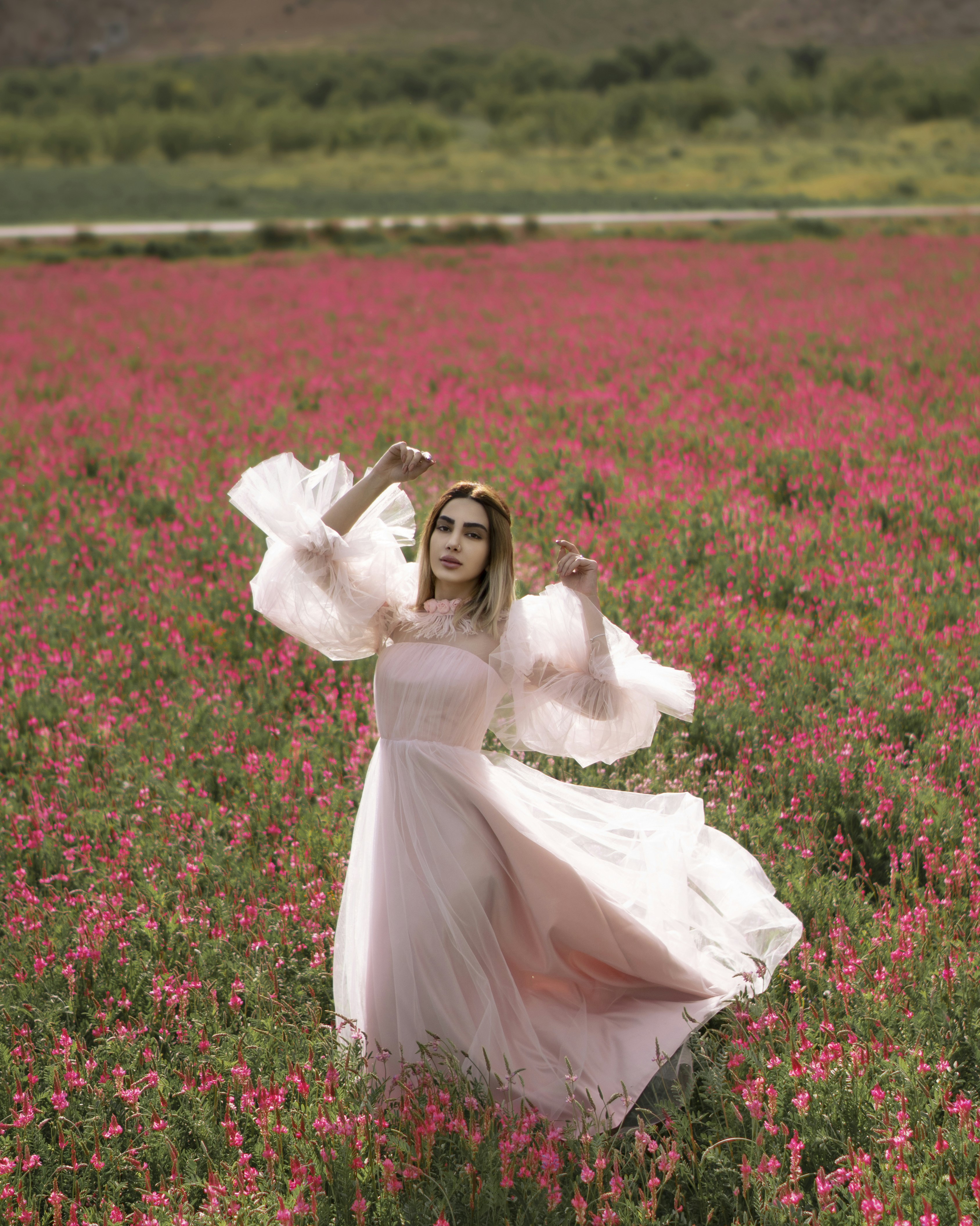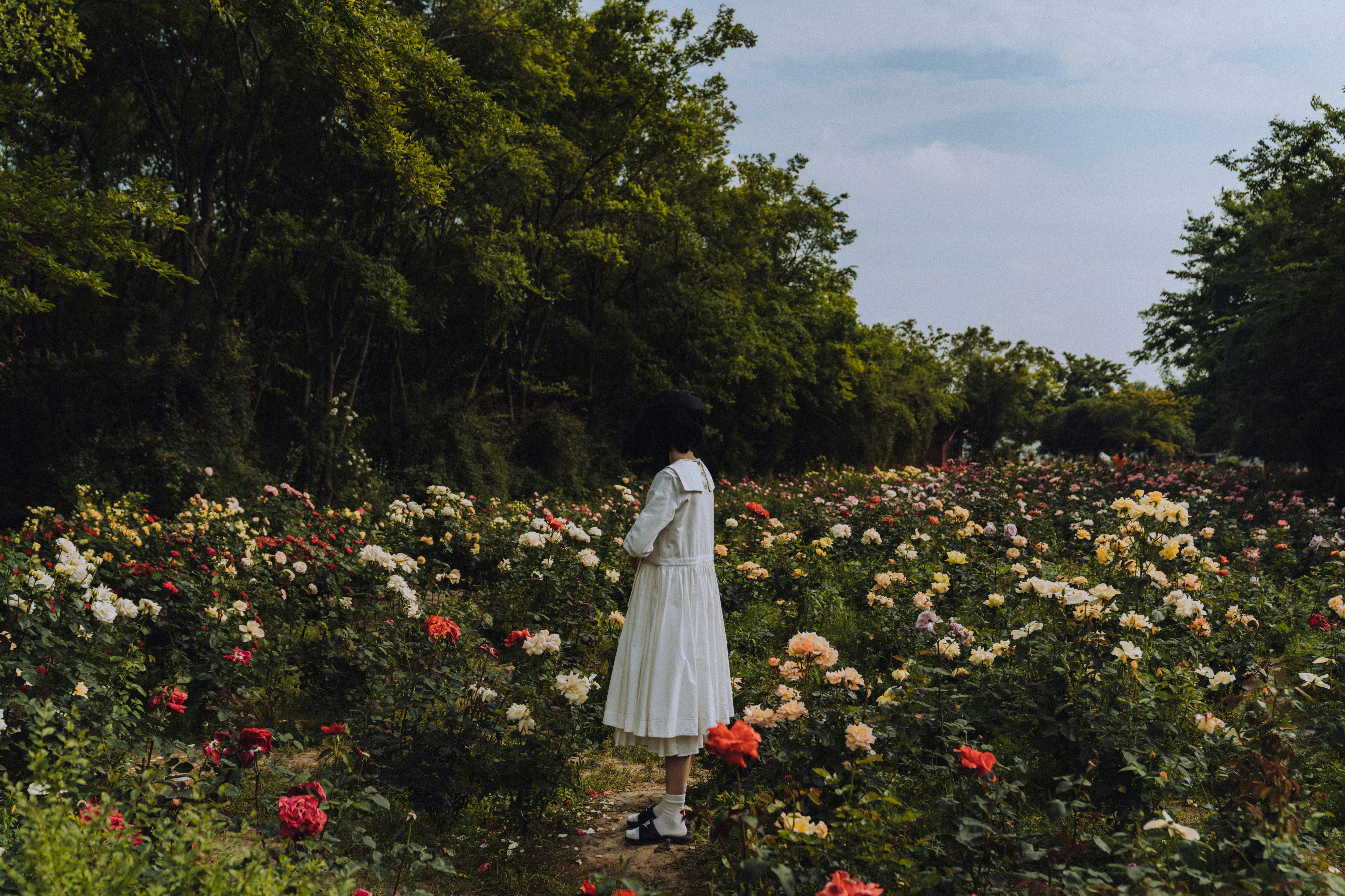 Woman In White Dress Standing On Flower Garden During Daytime Photo Free Grey Image On Unsplash